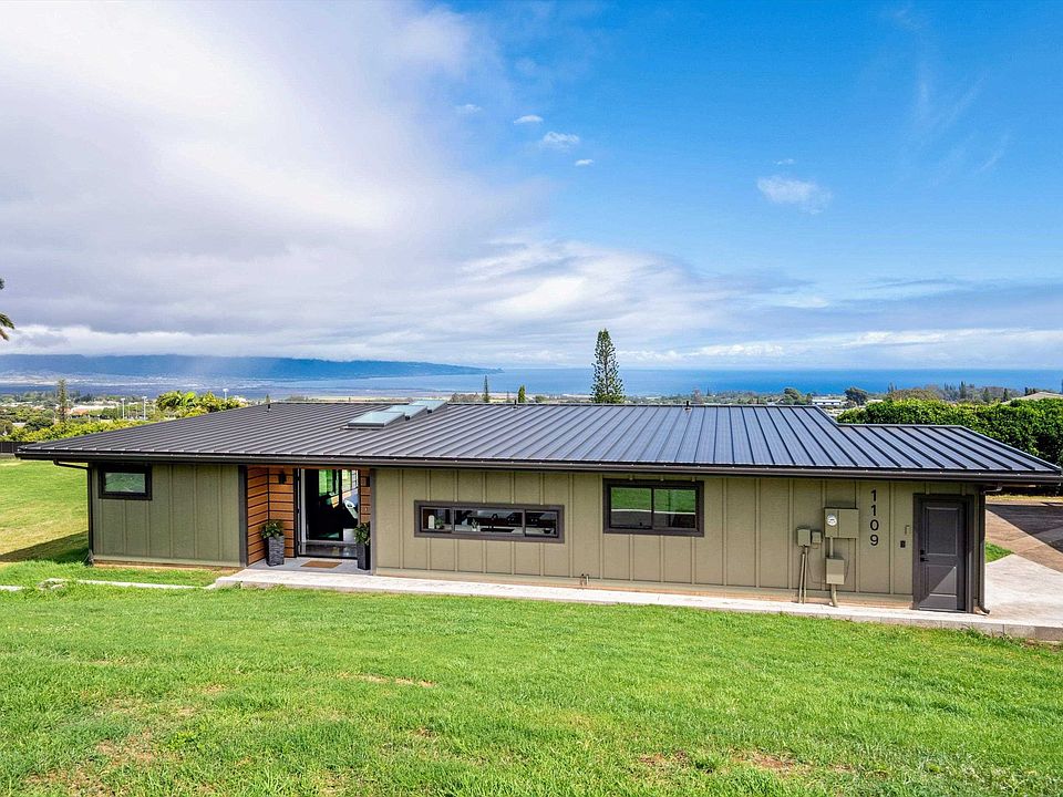 Modern meets Makawao. This stunning 1 bedroom, 2 bath residence offers an unparalleled blend of luxury, style & comfort. Completed in 2024, the open-concept living area is designed with modern aesthetics in mind, featuring sleek finishes, clean lines, embraces the cool Upcountry breezes and an abundance of natural light. The polished concrete floors bring a sense of cohesiveness throughout the home. The kitchen features quartz countertops, high end Frigidaire matte black appliances and soft close walnut cabinets & drawers. Mitered corner windows throughout allow a full panoramic view from the North Shore, panning across the West Maui Mountains all the way to Ma’alaea from the living area and bedroom. The sunsets are absolutely stunning. Enjoy your morning coffee or sunset cocktails with idyllic indoor/outdoor living at its finest under the covered lanai. Tinted skylights over the lanai create a light well of perfect subtle illumination. The bedroom offers the same panoramic views while offering a sense of privacy. Primary bath features contemporary fixtures and a luxurious walk-in shower with 3-Way Shower Head/Rain Shower/Hand Shower. The oversized garage features a smart level 2 EV charger along with a finished workshop area allowing for some flexibility. Additional tandem parking for up to 3 more cars is available. Laundry nook with side by side Samsung washer & dryer is situated across from the second full bath. Close proximity to Makawao Town's dining & shopping while the surrounding area offers bike riding, hiking & more. Experience the best in modern Makawao living with this exquisite home. This is a CPR.