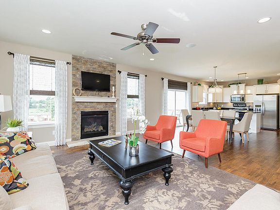 MOVE IN READY! NEW CONSTRUCTION by Payne Family Homes in the desirable Riverdale neighborhood. This popular plan has 4 BD, 2.5 BA & 2,480 s/f of open living space.This home has generous sized bdrms, a Loft, 2nd floor laundry, a Flex Rm/Den, Frml DR, side staircase design and a large Grt Rm that opens to the Kitchen & Cafe. Features inc 9 ceilings, Kit island, brkfst bar, 42 cabinets, st steel appl, granite c-tops, gas range, recessed lights, laminate floors in the Foyer-Grt Rm-Kit-Cafe-Mudroom, raised height vanity in the Mstr, custom paint color, ceiling fans in Mstr Bdr & Grt Rm, open stairs to the lower level, 2 car garage, Jeld wen Low E windows & more. The lower level has a R/I bath for an easy future finish.The ext is elegant & low maint w/vinyl siding, arch shingles, an upgraded front door, garage door w/windows, full yard sod, drain tile extensions,a 12x12 patio and prof landscape.Enjoy a quiet, peaceful setting but be minutes from shopping, schools, restaurants & services.