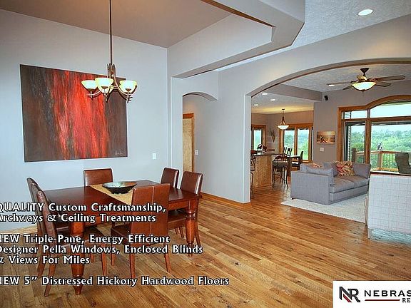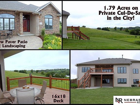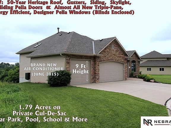 Gena Schriver, M: 402-320-4663, gena@youmatteromaha.com, www.nebraskarealty.com - Rare & Incredible Custom Walk-Out Ranch, Nearly 2 Acres, Exclusive Private Cul-De-Sac; Gorgeous 4 Bed+Office, Open Floor Plan Loaded w High-End Finishes! Top-of-the-Line Jenn-Air Appliances, Walk-In Pantry, New 5" hickory hardwood flrs, drop zone, 2x6 energy eff walls; Spacious Master, Spa Walk-In shower, access to 18x16 covered deck, mature trees, wildlife & views for miles; Exceptional LL (2013), stunning 2nd kit, Big BRs, Custom closets; New Roof, Pella Windows, AC & More; Near park, schools