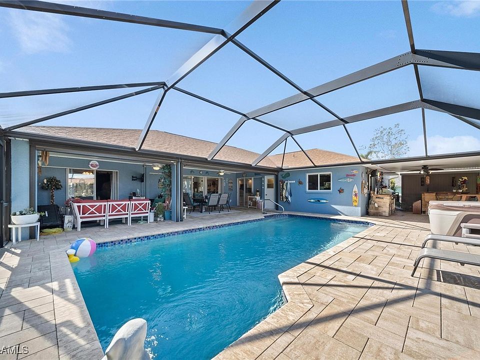 Ask about the current assumable mortgage of 2.375%. Don’t let this one get away! Your new home has it all and features 4 bedrooms, 2 bathrooms (one w/ pool access), 2 two-car garage, a large heated pool and pool deck, a large patio area, a heated spa/hot tub, an outdoor kitchen, white kitchen cabinets, quartz countertops in kitchen, large inside laundry/pantry room, motorized Storm Smart storm screens in all patio openings, four walk-in closets, and a Generlink LCEC generator hookup to the house. Coming up the front walk to the front door, you will notice the screened-enclosed entry with double doors featuring Miami-grade impact glass. Entering the home your eyes will be drawn to the openness of the living space, vaulted ceilings, and the sparking pool enclosed in the screened cage. There is a mini-split A/C-heating unit in the owner's suite for precise temperature control. Enjoy entertaining in your outdoor kitchen and bar area. Need storage, no problem! There is a Tuff Shed w/ interior 110v power and lighting in the backyard. New