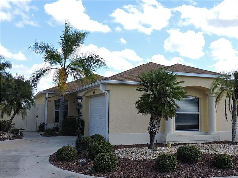 NO BOND! If you're looking for a perfect seasonal home or investment property, look no further. Located in the Village of Santiago, this lovingly maintained Block & Stucco Courtyard Villa is a great buy. The Garage (with painted floor) has been widened 2', making it 414 sq. ft - larger than most! The A/C was replaced in 2009 and the home has numerous upgrades. The Kitchen has GRANITE COUNTERS, Newer Oven, NATURAL GAS, Pull-out shelves, Custom draw pulls, CLOSET Pantry and a Cozy Eat-In area. The Living/Dining area is Spacious with Beautiful WIDE-PLANK LAMINATE floors, VAULTED CEILINGS and Custom Window Treatments. The Slider from the Living Room leads you to a Screened and Tiled Lanai looking out onto the open patio (EAST facing) with plenty of room to add a Birdcage. There are 2 Roomy Bedrooms, each with a PRIVATE BATH. The Master has a WALK-IN CLOSET, DUAL SINKS, TILED SHOWER and a separate room for the commode. There is also a door from the Master Suite to the covered lanai. The Guest bath has a Tub/Shower Combo with Cultured marble countertops. All wet areas are Tiled and there is Carpet in the Bedrooms. You will enjoy the PRIVACY and LOW MAINTENANCE YARD with NO GRASS! More time to enjoy The Villages "Lifestyle". The lovely home, which is centrally located won''t last long at this price, and NO BOND! Tax line reflects property taxes only. CDD line reflects combination of annual maint. $158.53 and fire District $81.