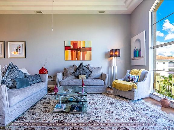 Beautifully appointed Penthouse living at Bellavista with amazing golf course and pool views! The soaring high ceilings, bright open floor plan with updated features create an inviting ambience to this Cortina Model 2 Bedroom and 2 Bath with Den. The Master bedroom has great views of the golf course with plantation shutters for privacy when needed, nicely appointed master ensuite bathroom with dual sinks, shower and spa tub. This meticulously maintained home also features, updated kitchen, hardwood floors in main living area, diagonal tile in lanai, 2 car garage, extra storage unit with easy access to pool and lounge area...Join the Gulf Harbour Yacht & Country Club lifestyle with golf, tennis, boating and social memberships!