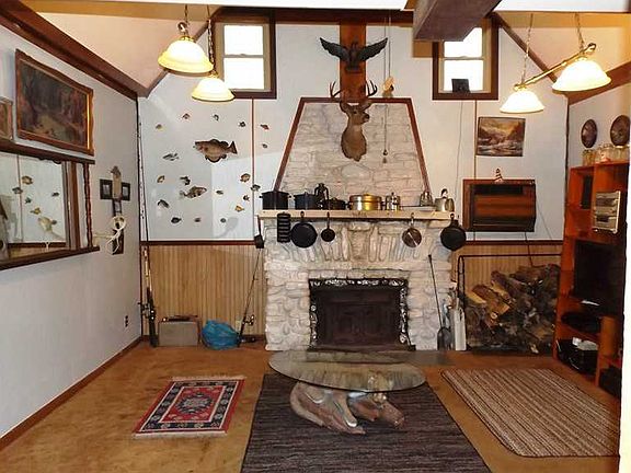 A unique three bedroom 1.5 story home with stone wood burning fireplace and large open area living room. Large 2 car garage. This home is located within walking distance to the lake, state park and state boat docks. Outside features a deck, patio and enclosed porch. This home would make a great year round home or fabulous vacation home.