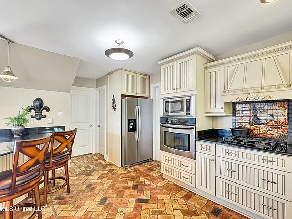 Upon entering, you'll be greeted by a cozy and inviting kitchen featuring warm ivory cabinetry, black granite countertops, stainless appliances, and a gas cooktop with custom tile mural detail. The peninsula offers additional seating and prep/serving space. The open floor plan flows effortlessly into the living room, showcasing stunning views and a beautiful brick fireplace as its focal point.