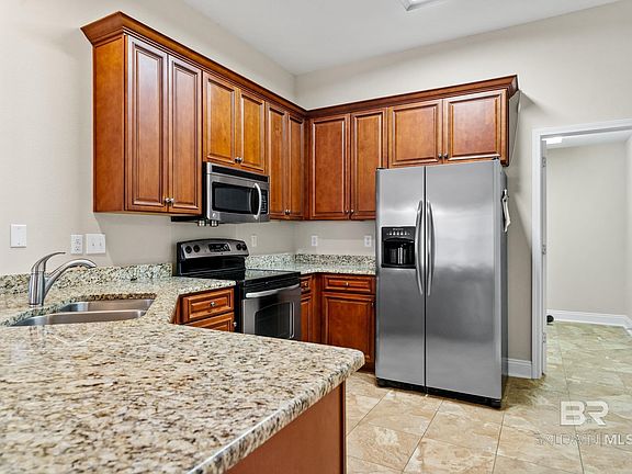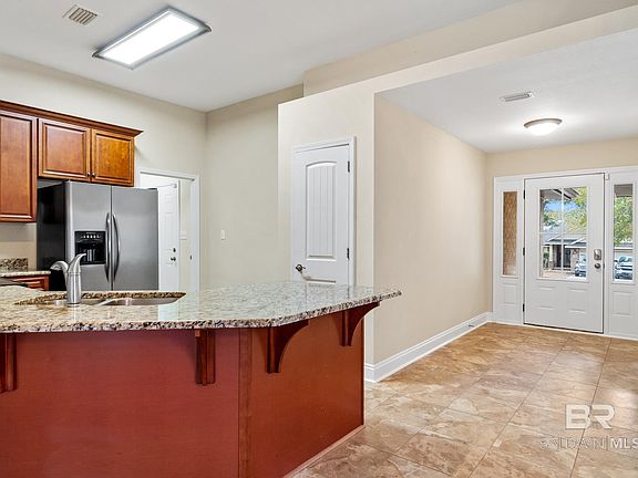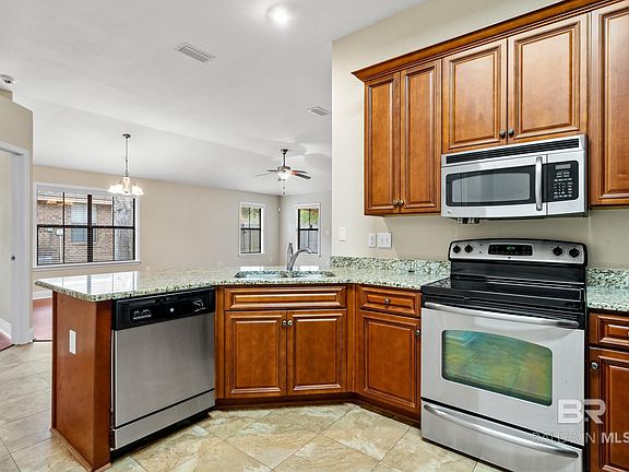 Fantastic All Brick home in a great location. Located close to Spanish Fort, Daphne and all of Baldwin County. This house comes with many great features such as keyless entry front door, hurricane shutters, blinds on the windows, brick construction, double car garage and a great layout and is located on a quiet street with a sizeable yard. Inside there is durable laminate wood flooring in the living room and master bedroom with tile in the kitchen. The kitchen is well designed with Granite countertops, Stainless Appliances, Microhood over the stove, a Pantry for storage, loads of cabinets and a bar. The home features tall ceilings and an open concept. The primary bedroom has tray ceilings, is private and has a large walk in closet. The attached bath has both a big oval tub and a separate shower with double sinks. This home is all electric and comes with a CARRIER HVAC unit. Outside is a big FENCED IN BACK YARD with a covered porch. PLUMBING THROUGH OUT THE HOME WAS REPLACED so it's all brand new. Home is super easy to view.