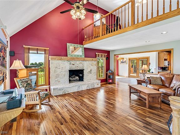 Basking in nature's elegance, this beautiful almost 8 acre property offers spacious and private living both inside and out. Spanning the entire length of the house, the welcoming wrap around front porch sets the tone of the home ~ a perfect blend of comfort with peaceful luxury. Built by Steve Martin, the living room greets you with soaring ceilings, a stunning stone gas fireplace and gorgeous black walnut wood flooring. The dining room boasts a bay of windows bringing the beauty of this stunning property indoors while also providing access to the massive outdoor wrap around deck, screened in gazebo and your private backyard oasis. This thoughtfully designed space, with it's proximity to the fully applianced kitchen creates a dream enviroment for entertaining. Not to be outdone, the walk-in closet, en suite bath and maple harwood flooring of the first floor master suite create a perfect blend for serene relaxation. A half bath and nicely sized laundry room round out the first flo