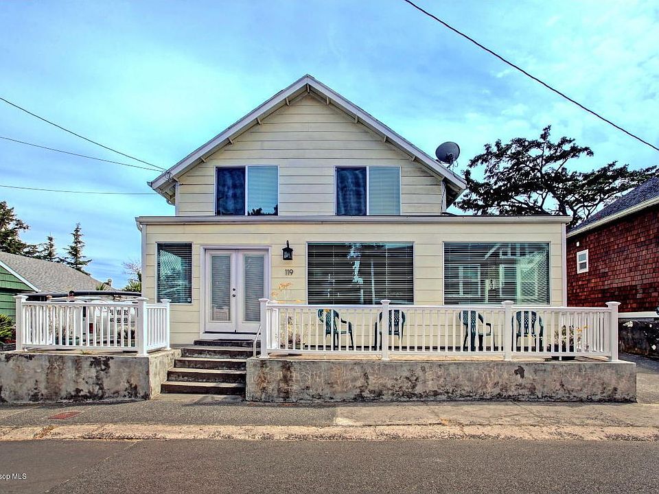 A cheerful enclosed porch welcomes you to this fabulous remodeled 4 bedroom 2 bath ocean view home and 1 bed 1 bath cottage with gas fireplace just steps to the beach. Great ocean views from the large open living/dining room with 2 sitting areas and a beautiful cozy fireplace. Oversized 575 sq ft car garage and 575 sq ft studio with bath over the garage. Currently a VERY successful vacation rental but would also make great full time residence or 2nd home.