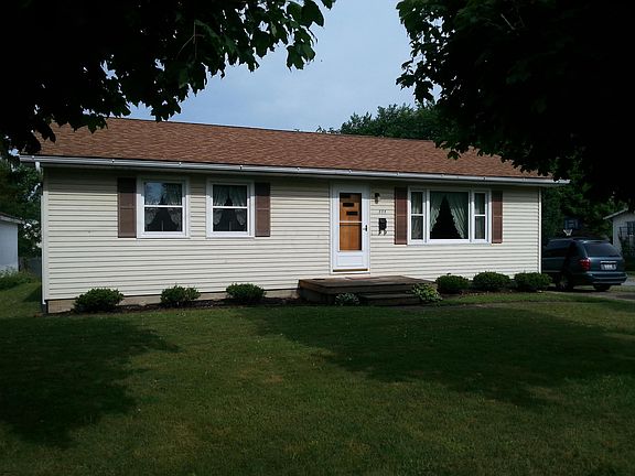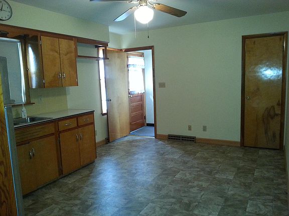One story home with lots of garage space. Has 2 bedrooms and 1 bathroom. Full basement has utility sink and lots of windows. Oak Flooring in living room and both bedrooms. Eat-in kitchen and bathroom have new flooring. Bathroom also has new vanity, mirror, lighting and large closet space. All rooms are freshly painted. Move in ready.