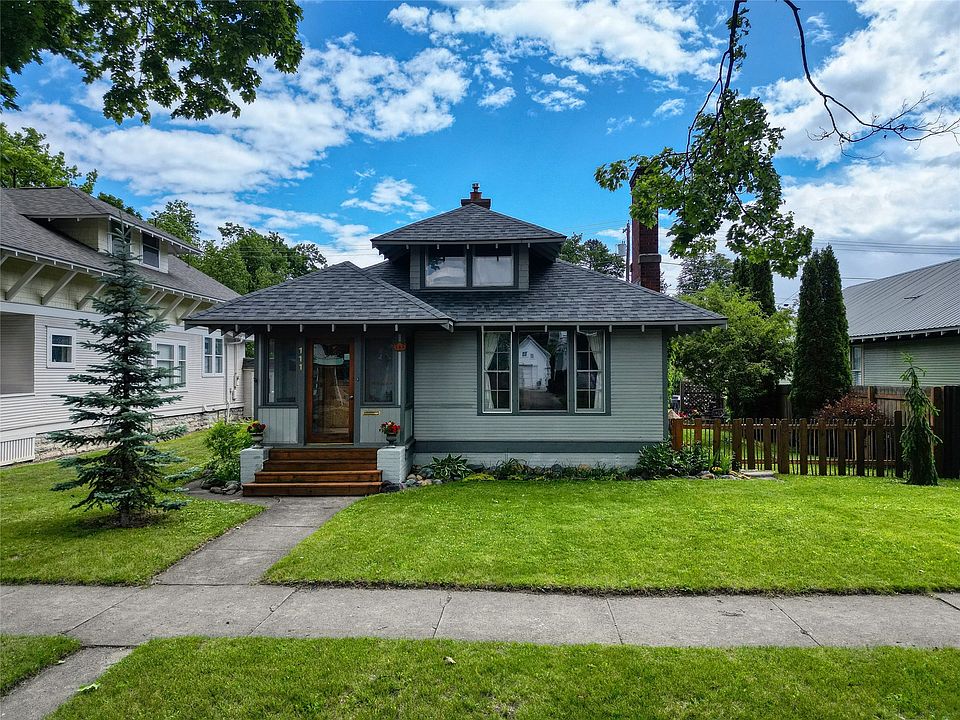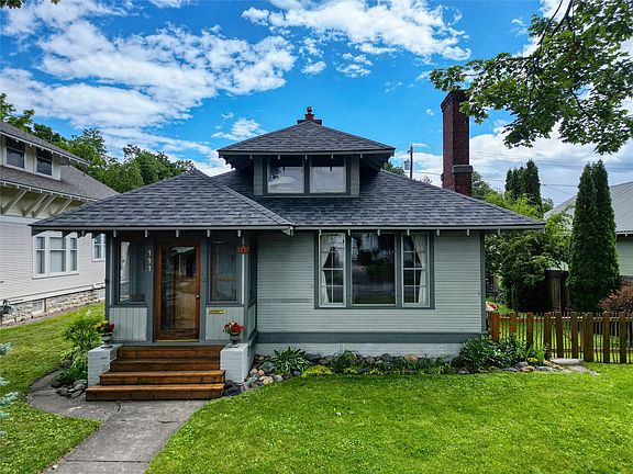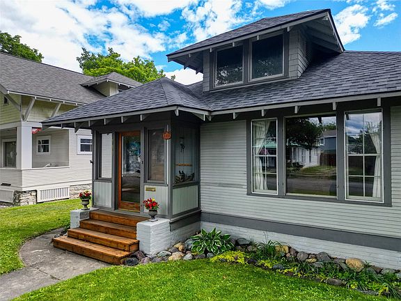 An East Side Kalispell Historic District Charmer Awaits. This very well maintained and remodeled home boasts over 2,400 square feet with 3 bedrooms and 2 bathrooms located close to parks and downtown. Built in 1908, this bungalow offers the artisan craftsmanship of the turn of the twentieth century with a modern 375 square foot primary ensuite addition that matches the old-world feel. The Owner's have loved, maintained, and updated the house over the last 19 years. All bedrooms, bathrooms one level with 1800 sqft on the main floor. As you enter, you are greeted by a glassed in porch with a stained glass oak door, a 9 foot ceiling shotgun style living room, wood fireplace, built in book shelves, and original oak flooring. The formal dining room comes with an ornate coved arch way and plenty of room to entertain your guests. Off the formal dining room lies a cozy breakfast nook with built in seating and an original bay window to gaze out into the south garden. The kitchen has been remodeled with quartz counter tops, slate backsplash, and a modern hood vent. The original layout of the home presents itself with two large bedrooms and a full bathroom with plenty of storage and walk in closets. French doors lead into the primary suite addition which includes new oak floors, a gas fireplace, built in book shelves, walk in closet, and a 4 piece ensuite bathroom. The large bathroom is impressive with a floor to ceiling tiled walk-in shower, and a huge soaking tub. Upon entering the basement you will find a bonus room. There is also plenty of storage downstairs. A new roof was installed in the fall of 2022. This beautiful home includes central heating and air conditioning with an air purifier. The backyard is full of well appointed perennials, a plum tree, and many ornamental trees. The side yards have plenty of isolated seating areas full of mature landscaping and raised bed gardens to enjoy all summer long. The 3 car carport was built in 2013 with a concrete pad, high clearance roof, and plenty of room to park your large vehicles right off the asphalt alley way. Close proximity to Kalispell’s many brew pubs, restaurants and boutiques. The Park Line Trail system that connects you to 3 corners of the valley is within a couple blocks. The location is spectacular. Call Austin Baumgarten 406-471-1847 or your real estate professional.