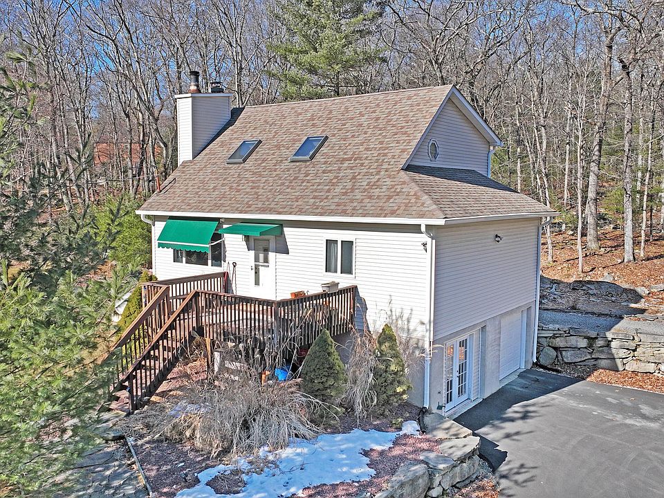 ESCAPE TO YOUR SECLUDED STORYBOOK-LIKE COTTAGE LOCATED IN POCONO MOUNTAIN WOODLAND LAKES WITH DV SCHOOLS. Situated on a private 1.31-acre property, this 3-bed, 2-bath home backs up to a large 160-acre parcel. Located just minutes from I-84 and historic, downtown Milford, PA which offers tons of restaurants, shopping, live theater, breweries, medical offices, and more. A newly paved, winding driveway leads to your private get away. Escape the cold into your stunning living room with a roaring fire from your wood stove insert! Cathedral ceilings, skylights, and hardwood floors create a huge wow factor. Select a book from your floating wall bookshelf and grab a cup of something warm and cozy up! Retreat to your spacious first-floor primary bedroom with a lovely walk-in closet and beautiful, bright oversized 1st floor full bath. Wide open stairs to the above catwalk give access to another full bath and two large bedrooms. Enjoy glowing wood floors throughout the home except in the dining area, kitchen, and baths which are all beautifully tiled. Entertain in your lower-level finished living space at your impressive custom bar! Take the party to your outside oasis in the zen-like tranquility of your super private backyard. Soak in the sun on your expansive patio, retreat to your pergola, or perhaps stroll the grounds taking in the natural beauty of your herb gardens and landscaping. Whole house generator! New gutters and dishwasher! Ductless AC, ceiling fans! This hidden gem is a must-see! Nearby skiing, waterfalls, hiking trails, game lands, shopping, great restaurants, & more! The community offers security, a clubhouse, tennis courts, an outdoor pool, two man-made bodies of water; the larger with a boat launch and sitting area, the smaller with a beach area and gazebo. Free home warranty transfers to the buyer at closing. Take the 3D Virtual Tour and schedule your private showing today! DV schools, no STR.