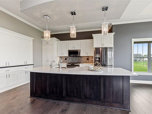 A lot of thought went into this 2016 Parade of Homes Winner. Extra touches similar homes do not offer. Stunning lower level includes a beautiful wet bar & entertainment zone, a theater zone with custom built-ins that flank a huge screen & projector, storage, guest bath, 2 bedrooms, space for a gym & walkout to a lush yard to grill. Main floor is a showstopper; upgraded island & upgraded oval countertop offering more surface space & mirrors the shape of the ceiling feature above for a stunning visual effect. Enjoy the pond view from your dinning room or the wonderful covered deck while listening to music. The surround system is another feature of the house. The walk-in pantry is extra space added to the home for a functional surprise. Kitchen features a one of a kind cabinet, doors fold in when open. Main floor includes a guest bedroom, office & the perfect master retreat. Near parks & trails. This home has it all.