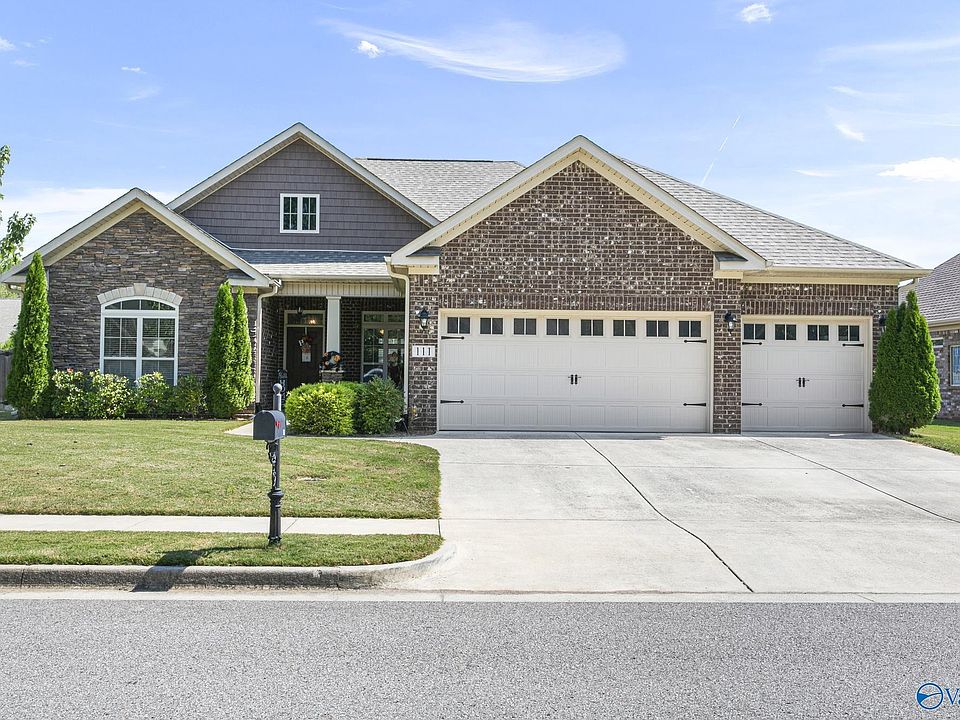 Beautiful like-new (2016) brick ranch home with stone accents. Three car garage with ample storage. The covered front porch leads into the foyer with hardwood flooring and crown moulding throughout the main living areas. The formal dining showcases craftsman paneling. The floorplan flows into the living room which features a gas fireplace with stacked slate surround, and the adjacent kitchen contains an oversized island, beautiful granite countertops with a gas stove & painted cabinetry with a glass subway style backsplash. Outside, the covered porch leads to a spacious backyard! View this home today before it's gone!