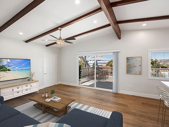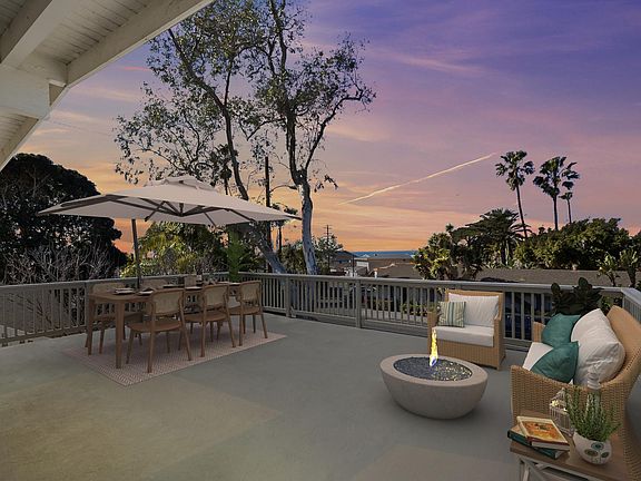 Be the first to live in this spectacularly remodeled home, the prime unit of a building re-imagined from the ground up. New and fresh with modern, luxurious styling, no detail has been spared in this unit aptly named "The View." The vaulted, beamed ceilings provide an elegant, open feel and frame the ocean views from the light and airy kitchen and great room. The slider opens to extend the living and entertaining space by more than 60% with a private, 644 sq. ft. deck with 270 degree views of the city, hills and ocean--extending to the Dana Point headlands. With space for multiple seating and entertaining areas, the deck provides a perfect spot to gaze at the stars while gathered around your propane fire pit. The gourmet kitchen centers on a 7 ft island that offers casual seating for your guests, a huge prep area and added storage below. The premium stainless steel GE appliances meet the requirements of the most demanding cook; a side-by-side 21 cubic foot refrigerator with water and ice; a 5 burner gas range with griddle option and a large, steam-cleaning, 5.3 cu ft capacity oven; and an ultra quiet 48 db stainless steel-lined dishwasher. High performance quartz counter tops, stainless apron sink, solid wood Shaker cabinets with quiet close hinges and drawers and numerous conveniently located outlets and increased power capacity to ensure that this kitchen has the look and function that discerning cooks demand. The view theme extends to the primary bedroom, which features a private entrance leading to a walkway and lovely view of Catalina Island. The ensuite bathroom has a large, tiled shower with sleek, frameless glass doors. The secondary bathroom features quartz counters and a tub/ shower with frameless glass shower doors. Both bedrooms have mirrored Shaker closet doors and tiered closet rods. Hallway linen cabinets provide additional storage, quartz countertops and an outlet for a convenient, out-of-the-way charging station for electronic devices. Pre-wired for both data and cable, the unit is move-in ready. The new wiring and expanded capacity extends to the garage: each unit's fully finished single car garage features an EV-ready hook-up for electric vehicles, automatic door opener, and security lighting. A full-sized parking space in front of each garage adds off-street parking for a second car. The building is located in a quiet, well-kept neighborhood close to restaurants on El Camino Real and the new North Beach entertainment district. Close to North Beach, the Beach Trail, Metrolink commuter rail, San Clemente Outlets, fine dining and historic downtown in the desirable West side of El Camino Real. Please ask for complete features list for this amazing home. Showings to start on Thursday, Feb. 23rd 1-3pm open house and Saturday, Feb 25th 1-3pm open house. 12 month minimum lease. Pets considered. Owner pays water, trash and sewer. Tenant pays all other utilities, including gas and electric. Smoking is not allowed on the premises. 1 car garage with 240V outlet ready for your EV hookup for electric vehicles, and long driveway will accommodate a second vehicle.