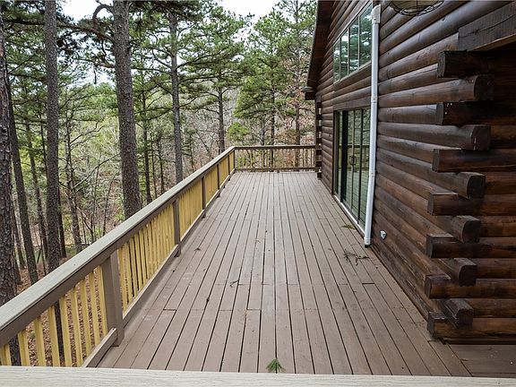 An Oasis nestled in the pines on private Bear Lake! Custom 2700 sf Log Home in gated community Flint Ridge Resort 'Foothills of the Ozarks' and 5 minutes to Cherokee Turnpike! Lake Views from everywhere, open LR, DR, KT cathedral ceilings to 302 sf loft, all view the lake, plus 1152 sf of wrap-around decks and porches. Main level has 1 bed/1 bath & hickory flooring. Downstairs more views from den and office area. There is another bath/bedroom (need closet) and large utility area doubles for safe room w/poured concrete walls. Attached carport area has hot/cold water, enters at utility room; full-house water filtration system, tankless hot water heater, foam spray insulation, whole house generator, propane, 5 zoned heat/air mini-split units, fiber optic internet. Detached garage/workshop has concrete floor, overhead door, electric and heat/air. Located between Tulsa & NW Ark, a 7,000-acre gated community on Illinois River, fish, golf, pools, restaurant, ATVs a way of travel. Add'l acreage available. See video link.
