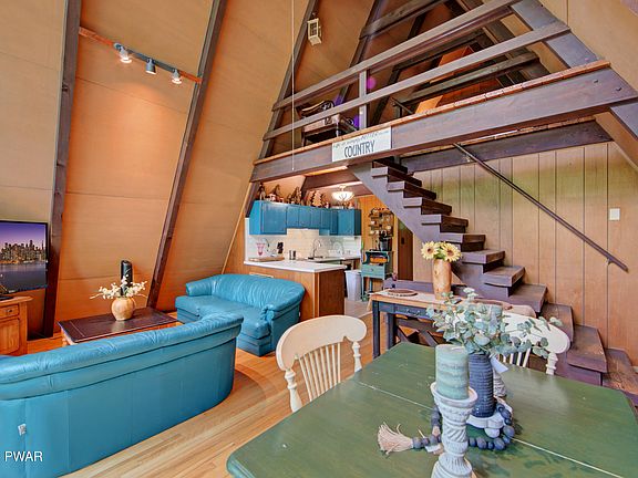 ESCAPE TO THE POCONO MOUNTAINS AND DISCOVER THIS CHARMING RUSTIC A-FRAME HOME, PERFECT FOR COZY MOUNTAIN GETAWAYS. This inviting retreat features a warm and inviting design with a distinctive A-frame silhouette that blends seamlessly into its natural surroundings. Inside, you'll find three bedrooms and one bathroom, a spacious open floor plan that maximizes the sense of space and light. The hardwood flooring adds a touch of rustic charm, complementing the home's natural aesthetic. Large windows throughout the home provide stunning views of the surrounding woods and mountains, filling the interior with abundant natural light. The cathedral ceilings enhance the airy, open feel, creating a sense of grandeur and spaciousness. A cozy wood-burning fireplace in the downstairs living area adds warmth and ambiance, perfect for relaxing evenings by the fire. Upstairs, a generous loft area overlooks the main living space and opens onto a spacious deck--perfect for enjoying morning coffee or sunset views while listening to the sounds of nature. This home is a true mountain retreat, offering comfort, style, and a deep connection to the beautiful Pocono Mountains surroundings. Located in the Beautiful Hemlock Farms Gated Community filled with Amenities: 1 Indoor Pool, 2 Outdoor Pools, Gym, Hot Tub, Sauna, Steam Room, Pickle Ball, Tennis Courts, Bocce, Playground, Dog Park, 24 Hour Security, Fire Department, EMT's/Advanced Life Support 24/7, Clubs, Beaches/Lakes, and Lords Valley Country Club is also contained within the boundaries of Hemlock Farms, making its golf, tennis, pool and dining convenient to members. Schedule your showing TODAY!!