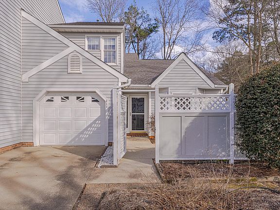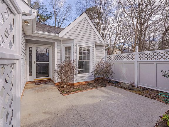 What a fantastic location in central Cary tucked into the Kildaire Farms community! Walk out the front door and access miles of trails, sidewalks, a beautiful path around the lake, and established wooded scenery all along the way. This lovely, end unit townhouse in Lakepoint Village has been updated with smooth ceilings, fresh paint, new light fixtures and is ready for your personal preference updates. The fenced and private front courtyard entrance has SO much potential if you like to plant and garden. As you enter the front door you are greeted by the brightness from all the exterior side windows and the open floor plan. The downstairs ceilings are vaulted from front to back in the home, making it feel spacious and light. This popular plan has a main level primary bedroom that has a ceiling fan, 2 closets, double sinks and a separated toilet, tub/shower space. The laundry closet is just outside the primary bedroom for easy access and comes with the washer, dryer. Your kitchen has a vaulted ceiling and a pass through that opens to the living and dining areas. Kitchen has great work space and an island with more cabinet space. There is a perfect sunroom with tile floors and lots of windows for your plants to live and thrive or an awesome art studio! This room has a door to the outdoor patio and rear yard area. Upstairs there are 2 large bedrooms that have easy access to the hall bath. One bedroom has built in bookcases and access to walk in storage. 1 car garage with door opener. Extra parking pad. Come look at this fast or it will be gone.