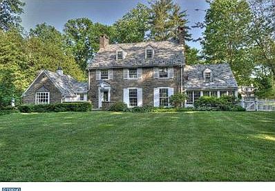 This extraordinary Stone Colonial built in 1926 is ideally integrated into its magnificent landscaped grounds. Sitting far off the road in a park-like setting this home spares no details: Beautiful random-width pegged oak floors sophisticated moldings and raised panel wainscoting throughout; Large living room with floor to ceiling windows a gas fireplace detailed in marble and brick; Deep-sill dining room with views to the back garden and French Doors to brick terrace; Library/Family Room with built-in book shelves a wood fireplace and Dutch door to enclosed sun porch with stone flooring ceiling fan and entrance to outside terrace and yard; Family Room with pine panel walls brick gas fireplace wet bar and sit-in bay window. The entire house has bright generous-sized rooms and windows as well as an ideal floor plan for relaxing or entertaining. There is a side terrace and private backyard with an in-ground pool and plenty of room for play. This home is special in every way and is convenient to public and private schools public transportation interstate highways shopping clubs etc.