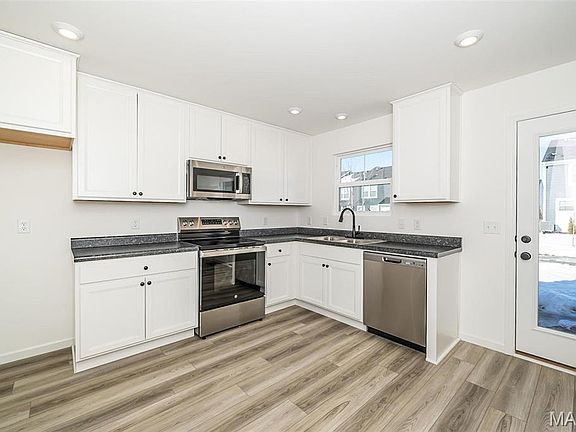 Some photos have been virtually staged. Trendy new Ashville plan by Fischer Homes in beautiful Townes at Streets of Caledonia featuring an open concept design with a spacious family room and an island kitchen that boasts beautiful stainless steel appliances, upgraded cabinetry with soft close hinges, laminate counters, pantry and walk-out to the patio. Upstairs homeowners retreat with attached bath plus 2 additional bedrooms and full bath. Full basement. 1 car garage.