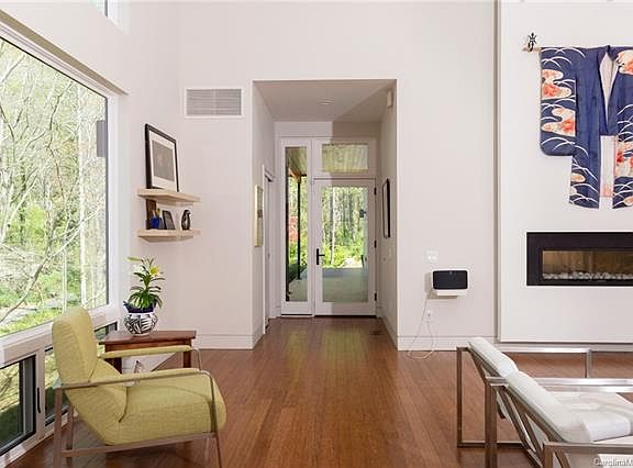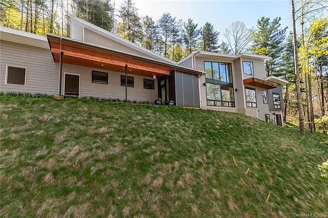 Stunning custom-built modern mountain home in North Asheville. This award winning Certified Green Built Home is nestled on a private, wooded 2.48 acre lot and features a flowing open floor plan with two master suites, soaring vaulted ceilings, magnificent windows, and modern details throughout. Designed to bring the outdoors in, the living room floor-to-ceiling windows create a living space encompassed by nature and saturated in beautiful natural daylight. Ideal for entertaining, the elegant and sleek kitchen flows to the dining room. Spacious bedrooms offer ensuites with tile walk-in showers, floating vanities, and a large soaking tub. Enjoy the multiple outdoor living areas including the custom outdoor hydrospa with 62 stainless steel jets, fenced-in patio, and side gravel patio. Located less than 15 minutes to downtown Asheville and just minutes to Fresh Market and restaurants. Extraordinary modern design, with the privacy of mountain living and convenience of in-town amenities.