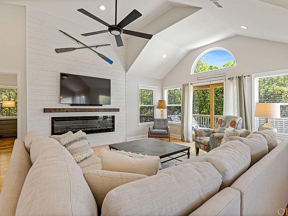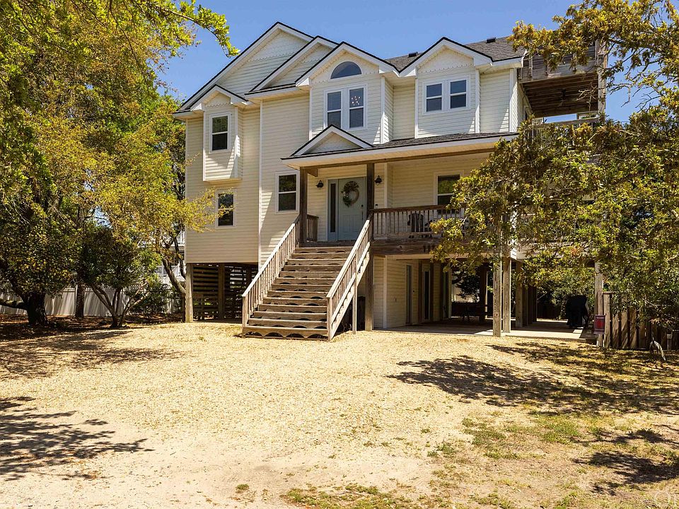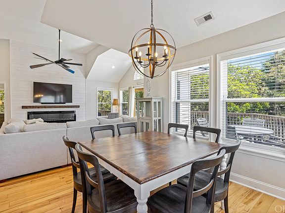 This completely renovated 4 bedroom home was featured on HGTV’s Island Life. Nestled in a park-like setting just north of the Village of Duck, this home features two owners suites plus bedrooms with one additional full bath and two half baths. On the top level you will find the great room with a fireplace, kitchen, a dining area, a breakfast nook, ½ bath and the main ensuite bedroom with a private deck. The kitchen is outfitted with GE Café Platinum Glass appliances, quartz countertops and a custom glass tile backsplash. The middle level has the second owners’ suite with private deck plus two additional bedrooms and a full bath. This level also has its own family room for watching tv or reading. The lower level has a game room, laundry room, ½ bath and access to the pool area. The top two floors feature wide plank Hickory hardwood flooring and tile. There are 3 levels of expansive decks including a roof top deck with ocean and sound views. The decks are outfitted with polywood outdoor furnishings. The golf cart is included so you can cruise to the beach or the Village of Duck. The home has a fantastic rental income and draws repeat renters every year. 2025 booking are already rolling in quickly. Schedule your viewing today.
