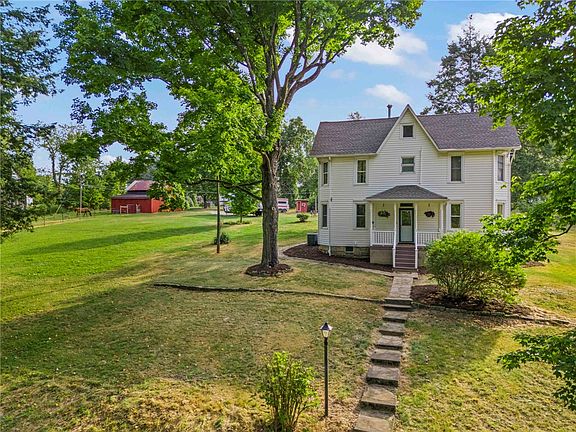 Welcome to this equestrian's dream, a charming 4-bed, 2-bath horse property just 18 mins from Morgantown, PA. Nestled on a quiet country road, this property features a re-sided bank barn, newly fenced 9-ac pasture, & 2 barns w/ metal roofs, ideal for your livestock. The spacious yellow 12x24 shed w/ electricity & a loft provides ample storage and workspace. Inside, the inviting screened-in mudroom leads to a cozy living room w/ a gas fireplace, while the basement boasts a wood fireplace for extra warmth. The open floor plan seamlessly connects the kitchen & dining area, perfect for family gatherings. The bedrooms are generously sized, ensuring comfort for everyone. Outside, enjoy the tranquil wooden deck surrounded by perennials & landscaping, perfect for peaceful relaxation. Horse trails wind through the woods, offering scenic rides, & deer stands are available for hunting enthusiasts. The property also includes a chicken coop & is shaded by large trees, enhancing its country charm.