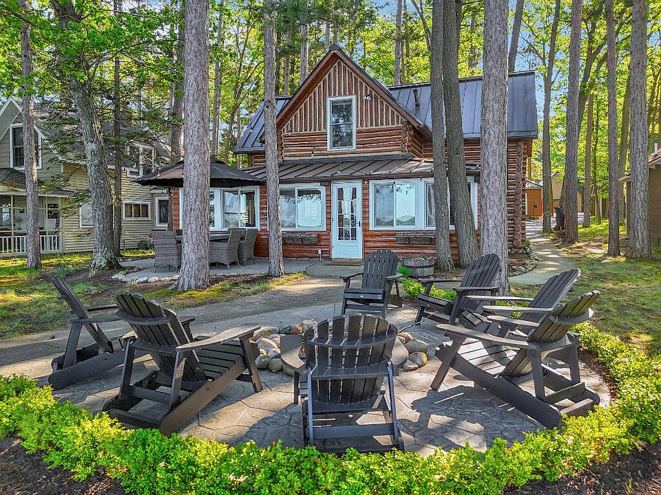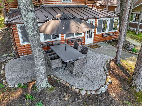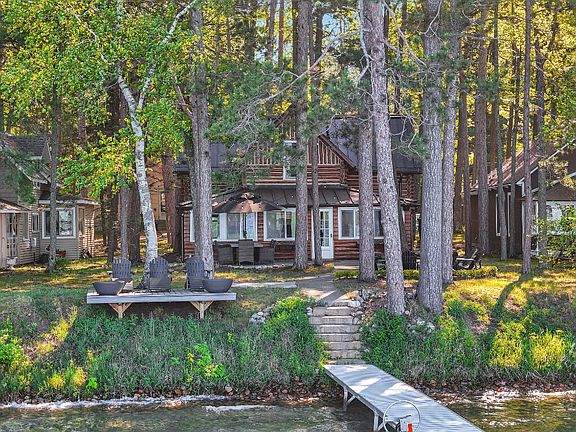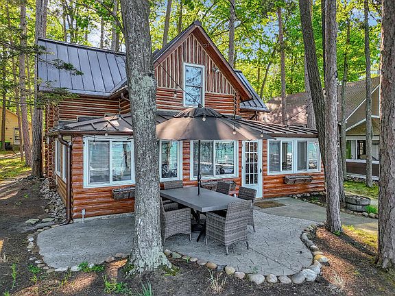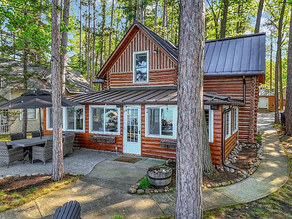 Classic full log home with great Chaney Point location on Higgins Lake's east shore. Enjoy magnificent sunset views from this beautifully finished 4 bedroom home featuring hardwood floors, solid surface countertops, natural gas stone fireplace, numerous skylights, metal roof. Extensive patio and outdoor seating areas overlooking the lake, offered completely furnished and move in ready including all bedding, cookware, table settings, outdoor furniture, dock, generator.