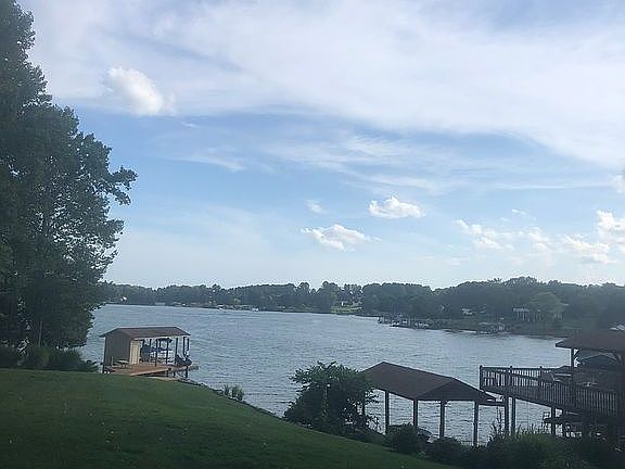 Lakefront Living with wonderful views of SML. Beautiful lake views from every room in this house. French doors from the kitchen lead onto the deck and patio area which provide extra living space which includes a BullFrog Spa and stone fire pit. Inside you’ll enjoy large Pella brand sliding glass doors from each of the 3 bedrooms, the family room, and dining room. Upstairs there are 2 large master suites, each with a full attached bathroom and dressing room. There is an additional bedroom on that floor as well. All 3 bedrooms have balconies overlooking the lake. Downstairs, the family room includes a working floor to ceiling River Rock fireplace. A fitted wood stove for the fireplace is currently stored in garage and included with sale. There is a one car garage that currently functions as a great workshop for the current owners. High speed internet now available. Invisible Fence around perimeter of lot. Great neighbors that live here full time. Harbor Village neighborhood. 117’ lake frontage New roof 2022 New HVAC 2017 Exterior updates and painted 2023 Interior renovations 2015 Property also Includes dock with boathouse built in 2001. Has deep water boat slip with lifts for a boat and a SeaDoo . From the yard there are walk down steps with a handrail leads down into the lake. Gentle slope from house to water.