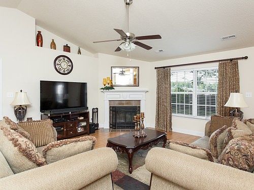 - FAMILY ROOM DESC: Ceiling Fan, Laminate Floor, Fireplace, 10? + Ceiling