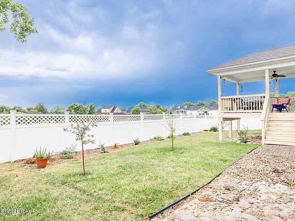 Built in 2020, this stunning ranch style home offers all the finer amenities you expect to find in today's custom homes. Upon entry from a covered front porch, you are welcomed into an open concept living/dining/kitchen featuring tray ceilings and beautiful wood laminate flooring featured throughout the homes living areas. The kitchen features faux marble countertops and beautiful white cabinetry. A full line of stainless steel appliances, including a washer and dryer, all to remain. Dining area open via French doors onto a large, covered custom wood deck providing great space for family leisure and entertaining! You will fall in love with the backyard which is enclosed by white vinyl decorative fencing. The views from the deck are second to none giving the home a feel of country charm while being located with quick access to downtown Bardstown. The right wing of the home includes two bedrooms and a guest bath. The left wing of the home consists of a large primary en suite with a private second full bath featuring dual vanities and a large walk-in shower as well as a walk-in closet. Completing the home is a two car garage and laundry room. Don't miss out!