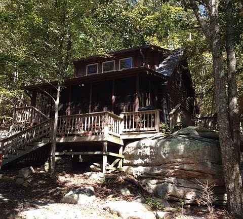 Treetops is a Wonderful rustic log cabin nestled amongst giant boulders and hardwood trees. A large stone fireplace is the centerpiece of this cozy cabin. The timber walls and antiques add more charm to this mountain get away. The large bedroom has a vaulted ceiling and expansive views of the tree tops. A full width screen porch and multilevel decks provide plenty of room for outdoor entertaining. Fully renovated bath with stack w/d. This charming cabin comes with a new double carport and includes all appliances. It's ready for your enjoyment!