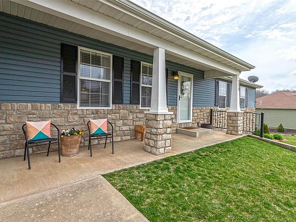 Upgrades abound in this Brush Creek Beauty!Enjoy the covered front porch as you take in the green lawn, supported by the inground irrigation system.The living room welcomes you with Pergo laminate flooring leading you to the kitchen where Quartz counters, subway tile backsplash & open concept to the dining area on through to the oversized, covered deck await.Down the hall, the master bedroom includes a jetted tub and separate shower, double bowl vanity and huge walk-in closet.Two additional bedrooms & one full bathroom round out the main floor.Each bedroom is newly carpeted for comfort. Downstairs, find a laundry room, under the stairs play space, oversized family room, two additional bedrooms, one bathroom and a huge storage room, perfect for all your needs, including a home gym! Family room provides access to covered patio & fenced yard, along with ample space for your jungle gym! Located minutes from I-44 & FLW with the privacy of a wooded view, all while in a subdivision!