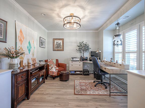 Exceptional Morningside Lane floor plan situated on a quiet cul-de-sac street, with peaceful backyard setting on one of the most desirable streets in 55+, Active Adult, Del Webb at Lake Providence. This beautifully upgraded home features 3 bedrooms, 2.5 baths, and a 2-car extended garage with insulated garage door. Attic over garage has floored extra storage space. Garage has shelving and floor covering. LVP floors, upscale fixtures and plantation shutters flow throughout this home, offering elegance and comfort in every room. Enjoy formal gatherings in the separate dining room with tray ceiling, or work comfortably from the dedicated office space, which features custom bookcases. The chef’s kitchen is complete with a large island, quartz countertops, recessed Wolf gas cooktop, abundant upgraded cabinetry with in-cabinet lighting, and a spacious walk-in pantry. The living room is both cozy and modern, featuring an electric fireplace. Retreat to the luxurious primary suite with tray ceiling, ceiling fan, and spa-like bath offering quartz double vanities, private water closet, extra large walk-in shower, and a huge walk-in closet with custom design. Step outside to an entertainer’s paradise: a large covered patio with roll down shades and epoxy covered floor, natural gas outdoor fire pit and grill, leading to an irrigated flower garden, all designed for unforgettable outdoor living. Del Webb offers Resort-style in door and outdoor pool and hot tub, serene 15-acre lake with paddle boats and kayaks, Event lawn and pocket parks. 5 miles of walking and biking trails, fishing, pickleball courts, tennis courts, and bocce courts, community garden plots and indoor fun at the clubhouse. 5 minutes from Kroger and shopping. Schedule your showing today!