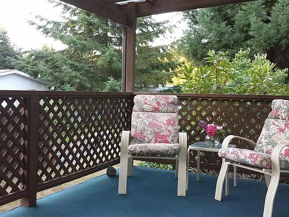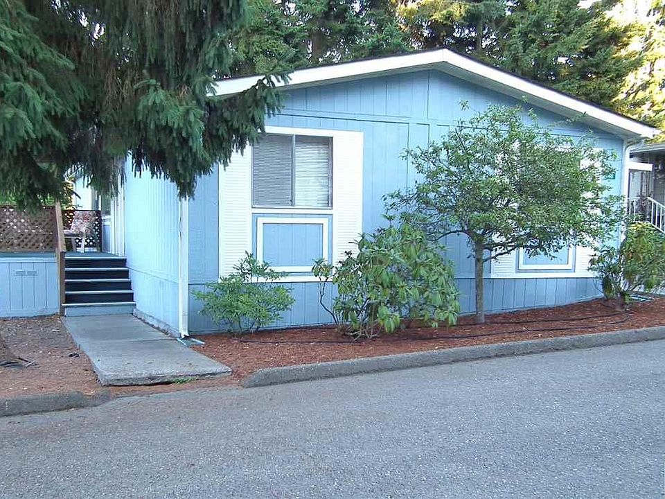 Nicely kept 1988 3 bedroom 2 bath doublewide manufactured home in senior park. Lovely landscaped lot with deck and small pond. Many trees, flowering plants & shrubs. Arbor with bench seat, detached storage shed/workshop and partially fenced back yard. Home offers open floor plan with prvt master bed & Bath, 2 guest bedrooms & full guest bath. Large windows bring in light and view of gardens & pond from master bedroom. Covered entry porch & large covered carport deep enough to pull in 2 vehicles.