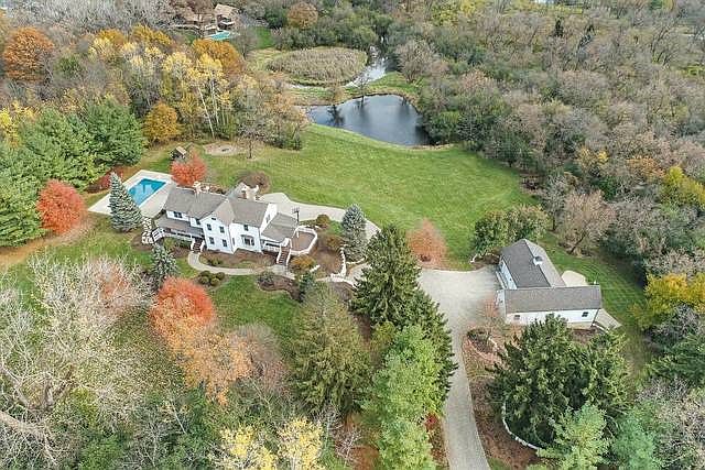 This wonderful Barrington Hills estate has been completely restored and additional buildings and space added by the current owner. Over $1.8 million has been invested into this property. The main home has a farmhouse feel with antique fireplaces, staircases, and exposed brick kitchen. The living room features walls of windows overlooking the pool and the amazing water view. The family room connects to the sunroom again offering an amazing view out the bay window. The formal dining room is ideal for entertaining. The first-floor den is perfect for E-Learning or a home office. The kitchen offers commercial grade appliances and soapstone counters. The luxury owner's suite boasts a wood-burning fireplace and European bath plus a large walk-in closet. The other spacious bedrooms share the hall the bath. There are two laundry areas. The attached garage is heated and features a dog wash. The heated and cooled multi-level detached garage holds 5 cars, compressor stations, a full wall of cabinet storage, hot and cold water, refrigerator plus stereo and audio throughout. The second level of the detached garage is partially finished and could used for office space or additional storage. Outdoor activities are easy at this property. Go for a swim in the inground pool, fish in the private stocked pond, enjoy the firepit. Also adjacent to the riding trails. This home has it all.