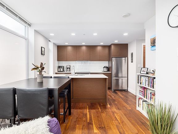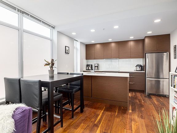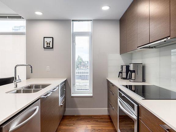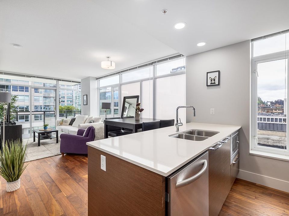 The Prescott is the perfect location in Central Lonsdale, close to all amenities! This corner 1 bedroom is a modern open floorplan with abundance of natural light and high end finishes throughout the home. Floor to ceiling windows, recessed lighting, chef kitchen with stainless steel appliances and large island. Large living and dining area flows into your oversized balcony great for entertaining or relaxing while taking in the city and mountain views. Bedroom is the perfect size and spa like bathroom rounds out this amazing home! Exceptional building with fitness club, dog wash station, and secured parking. Whole Foods, Steve Nash Gym, Restaurants, Coffee Shops and more just outside your doorstep!