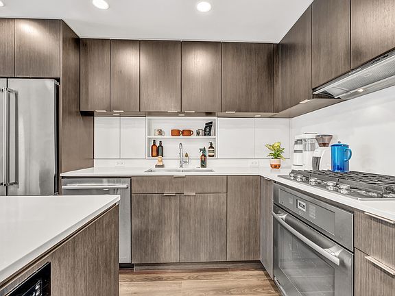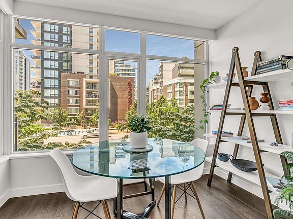Fantastic opportunity at popular Block 100 in the Olympic Village. This 665 sqft 1bed plus den home maximizes every inch of space. Cook and entertain in your gourmet kitchen with large island, ample storage and full size SS appliances, sip your morning coffee on your spacious balcony or relax in your living area with expansive windows allowing an abundance of light and plenty of room for your favourite furniture. Take advantage of warm flooring, Air Conditioning, office nook and den space. Secure parking and storage round out this stunning home located in a well maintained concrete building with gym, concierge, common roof top, amenity room with pets and rentals allowed. Only steps from the seawall, SkyTrain, coffee shops, restaurants and more. Open Thursday 5-6pm and Sat/Sun 1-3pm.