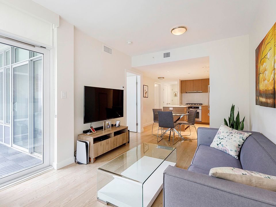 The CONDO: Open & efficient 604 SF 1 Bed + Den & 1 Bath floor plan features Air conditioning, wide plank laminate floors, full size Kitchen Aid S/S appliances, 5 burner gas range, quartz countertop & backsplash, kitchen island, tons of counter/cabinet space & covered balcony. The primary bedroom is spacious & den can make a great home office or storage room. The BUILDING: Built by Onni Properties, this building offers concierge service, full sized gym, 2 party rooms, bike storage & rooftop garden. The LOCATION: Just steps from False Creek Sea Wall, Downtown, Science World, Olympic village shops and restaurants & Skytrain stations. This building is short term rental friendly, great for investors & 1st time buyers. 1 Parking + 1 Storage & Pets/Rentals allowed.
