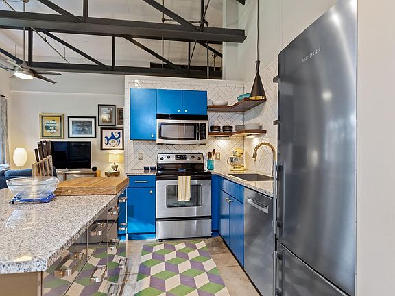 Historic sleek design qualities are dramatically accentuated with high ceilings and a full wall of windows. The contemporary look of exposed metal beams and ductwork lends itself to a very open spacious feel. Painted cabinets, with some open shelving, tile backsplash, lighting, granite and quality newer appliances make the kitchen beautiful and very functional. In-unit HE front load washer and dryer. Closets have been maximized for storage. Both an underground heated garage and designated parking lot spot. Quiet enjoyment, between floors, comes from the solid concrete flooring.