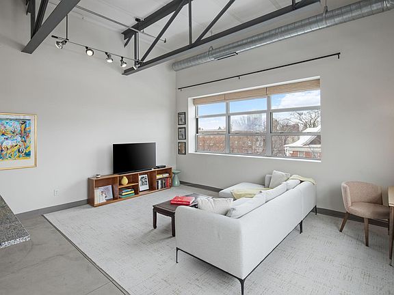 Sleek center islandBeautifully updated industrial-style loftSoaring ceilingsExposed brickBright open-concept layoutIn-unit laundryOversized windows