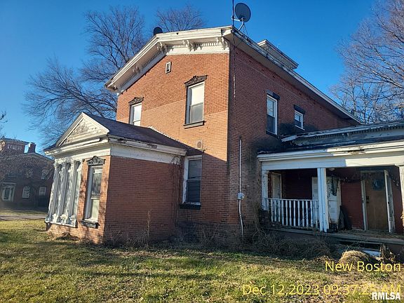 YES, this home needs a lot of work, but want to say - COMPLETED IS A MASTERPIECE AND A PIECE OF Illinois History. Blt in 1857 by Elmor J. Dennison - building 2 homes - 1 for each daughter. The sister home is across the street. Look at features of a widow's watch, flying staircase & dental block crown molding. Located near Mississippi River, summer fun fishing & boating activities - in winter-hunting, eagle watching & winter sports.. Imagine horse-drawn carriages, rain barrels overflowing in bkyd; envision era of Abraham Lincoln (who laid out New Boston); imagine your daughter ascending down the walnut staircase in her flowing wedding gown; longingly awaiting return of husband from the river as she watched from the widows walk. Boundaries: N-tree line; W-alley; E & S-streets. Ornate woodburning fireplace in LR; gas fireplace in DR. Please try to envision the home as it was when restored. SOLD AS IS. UTILITIES ARE OFF. Possibly a B&B or Air B&B.