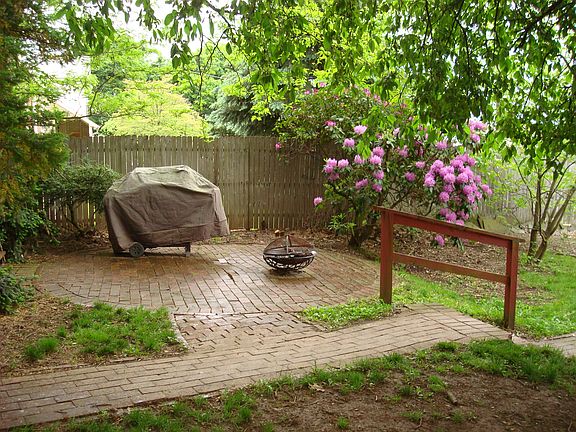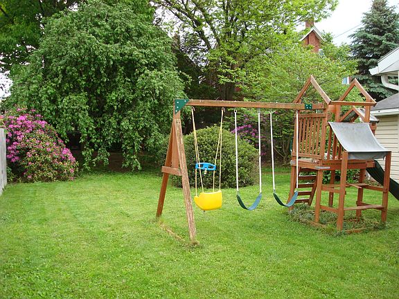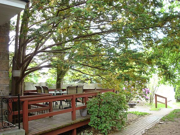 Wow! What a find in E-Town Boro! Magnificent 1916 SF Brown Stone home, stone fireplace on 1st floor and brick Fireplace in lower level, hardwood floors, ornate trim, rod iron, staircase, crystal chandelier in dining room, arch doorways, kitchen pantry, gorgeous Cedar tree canopy over deck, brick paths lead to out-door patio & garage, garage holds 4 cars and giant shed attached.