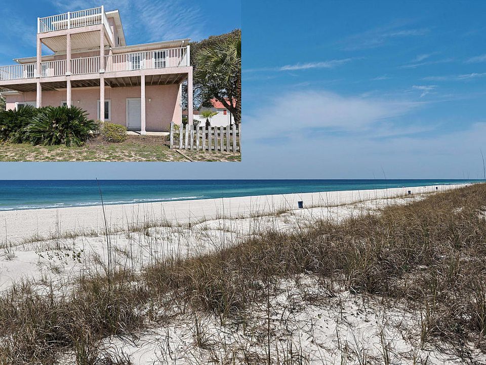 AWESOME Gulf Views! Huge $26,000 price drop on 4/28/15This is the one you've been waiting for! Located on West End of PCB in Laguna Beach and only 3 lots off of FBR behind famous landmark Thomas' Donuts. 50x150 lot with 2 houses. Small cottage up front and 3 story stucco home built in 2003 at rear of lot. Incredible Gulf views. 1,795 sq ft. BR on first floor, full bath, kitchen, living/dining room w/fireplace. 2 BR's w/ensuites on second floor and 3rd floor can be 4th bedroom or den w/wetbar. Huge balconies on 2nd and 3rd floors. On septic but sewer is available. Large storage shed. Come see why this property is so special.