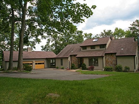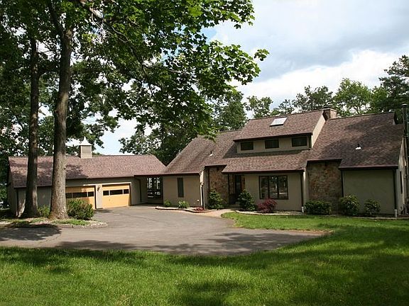 3423 sq. ft. Contemporary Cape situated on premium, 2.6 acres of Shenipsit Lake Reservoir! This 8 room, 4 bedroom, 2 and 1/2 bath home offers unsurpassed southerly views of this limited, public-accessible lake! Set back from the road with its distinctive, fieldstone stonewall front property line, this unique, private home contains many defining features. A large, center-island kitchen with sliders on 2 sides, and a large, wrap-around deck, offers spectacular views of the lake! The large, adjacent, vaulted-ceiling living room with built-in, its floor-to-vaulted-ceiling stone fireplace with wood stove insert, and numerous, lake-facing windows - along with its open-to-dining-room space - will certainly be the center of many entertainment functions! The first-floor Master bedroom - with full, jetted tub Master bath - takes full advantage of the views with its large, lake-facing sliders. The second floor, overlooking-living-room loft is ideal as an office or TV area. The lower-level houses 2 additional bedrooms, and a common bath. There is also a large, lower-level recreation room with woodstove and more, lake-facing sliders to a large, fenced-in, in-ground pool with more breath-taking views of the lake! The 2.6 acres includes additional boundary stone walls, sizeable lake frontage with lake access, and many exemplary views of the lake! Newer roof, new pool fence, oversized oil tank, engineered septic system, solar hot water system, new living room carpet,