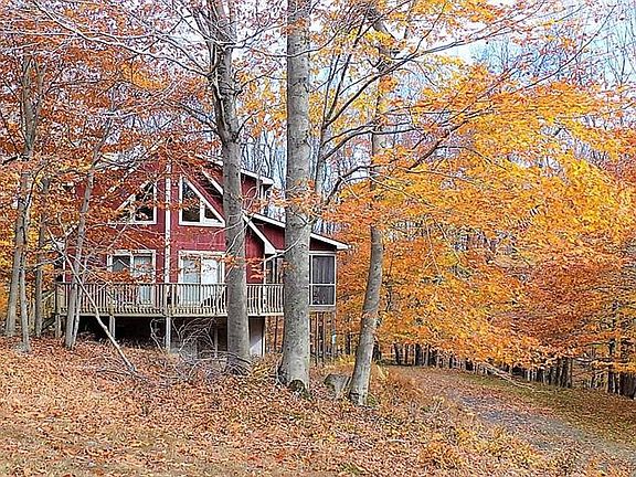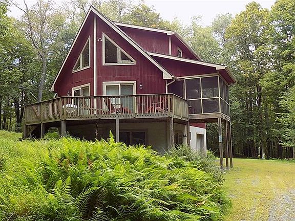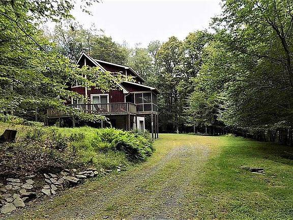 Serenity awaits you at this Prow Front Mountain Chalet where you can view Whitetail Deer from your own Porch!. This 3Br, 3Bath Chalet is located in the Skyview Lake Community and also within a 5 minute ride to Promised Land State Park, in the Heart of the Pocono Mountains! Relax by the Stone Fireplace in the Living Room on those chilly nights! Other features include Center Island Kitchen, Open Floor Plan w Plenty of Custom Glass and Gorgeous Hardwood Flooring, Master Suite is Spacious and has walk-out to your own balcony overlooking the very private rear yard! Add in a 1-Car Attached Garage, Lower Level Family Room w 3rd Full Bath and Walk-Out Sliders, Screened-In Porch and Spacious Front Deck! Skyview Lake has Clubhouse, Outdoor Pool, Private Beach and Road Maintenance! Wallenpaupack Schools!