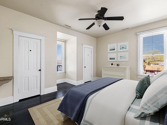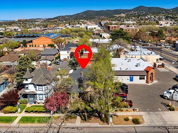 Rare opportunity to own one of historic downtown Prescott's iconic Queen Anne Victorians, just up the hill from Courthouse Square. With Business General zoning, 5 parking spaces, gated RV parking, easy street parking and an ADA-compliant ramp, the Rudolph Baehr house is ideal for a live-work lifestyle, two-unit vacation rental (zoned HVAC and water heaters), professional offices, restaurant with huge shaded patio or single family home. Potential to add a garage on the rear alley with additional living space above. Listed on the National Register of Historic Places which keeps taxes low ($912 per year). Baehr was a well-known Territorial photographer and painter who is buried in the Odd Fellow cemetery. Updated for modern living while preserving original details like Eastlake door knobs and stained glass windows, this gracious home features a main level with a large parlor, enclosed Arizona room, eat-in kitchen that opens to the rear patio, butler pantry, bedroom and two baths. Upstairs are three bedrooms, a bath, kitchen and family room. The basement has vast amounts of storage and a dehumidifier. New decorative cedar shingle roof and AC on the main level. A short walk to over 100 shops, restaurants and bars in the downtown entertainment district. Close to Dignity Health, Yavapai College, VA campus, public and charter schools, National Forest trails for hiking and biking.