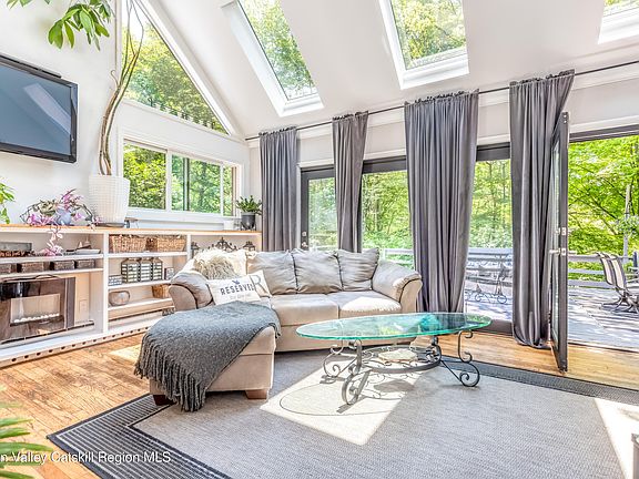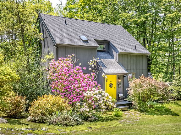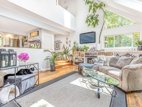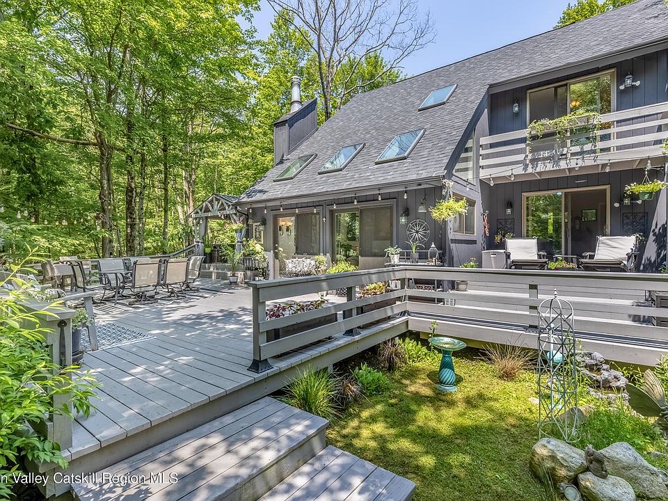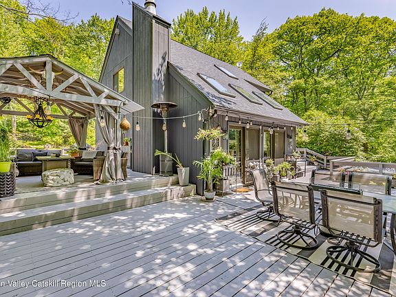 Perched gracefully on a hillside and nestled on two private acres, this contemporary three-bedroom, two-bath home offers a harmonious blend of thoughtful design and natural beauty. The open layout is anchored by a sunlit living room with a soaring cathedral ceiling, skylights, and a wood-burning fireplace—an inviting centerpiece for cozy gatherings. The updated kitchen and dining area open directly onto a generous wraparound deck, complete with a gazebo, creating an ideal indoor-outdoor lifestyle for morning coffee, alfresco meals, or relaxing under the stars. The main bedroom with ensuite is conveniently located on the first floor and features direct deck access, while two additional bedrooms—one with a private balcony—and a full bath upstairs provide comfortable accommodations for family or guests. Nature enthusiasts will appreciate the peaceful stream that borders the property and the mature gardens that frame the home's exterior. The parklike setting offers a tranquil, retreat-like atmosphere with seasonal mountain views that shift beautifully throughout the year. A charming pergola further enhances the outdoor space, making the yard a great space for entertaining or quiet reflection. Recent improvements include a new roof, fresh paint inside and out, and a regraded driveway. Privately sited, yet just minutes from Sam's Point and the Shawangunk Ridge State Forest, this home offers easy access to world-class hiking, scenic vistas, and outdoor adventure. With a peaceful setting that feels worlds away, this property is the ideal retreat for those seeking both privacy and proximity.
