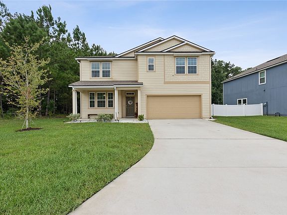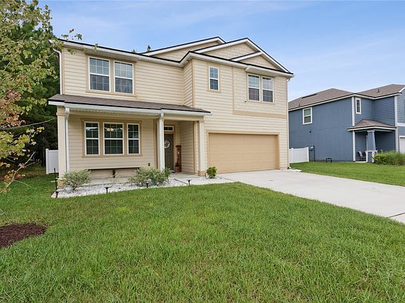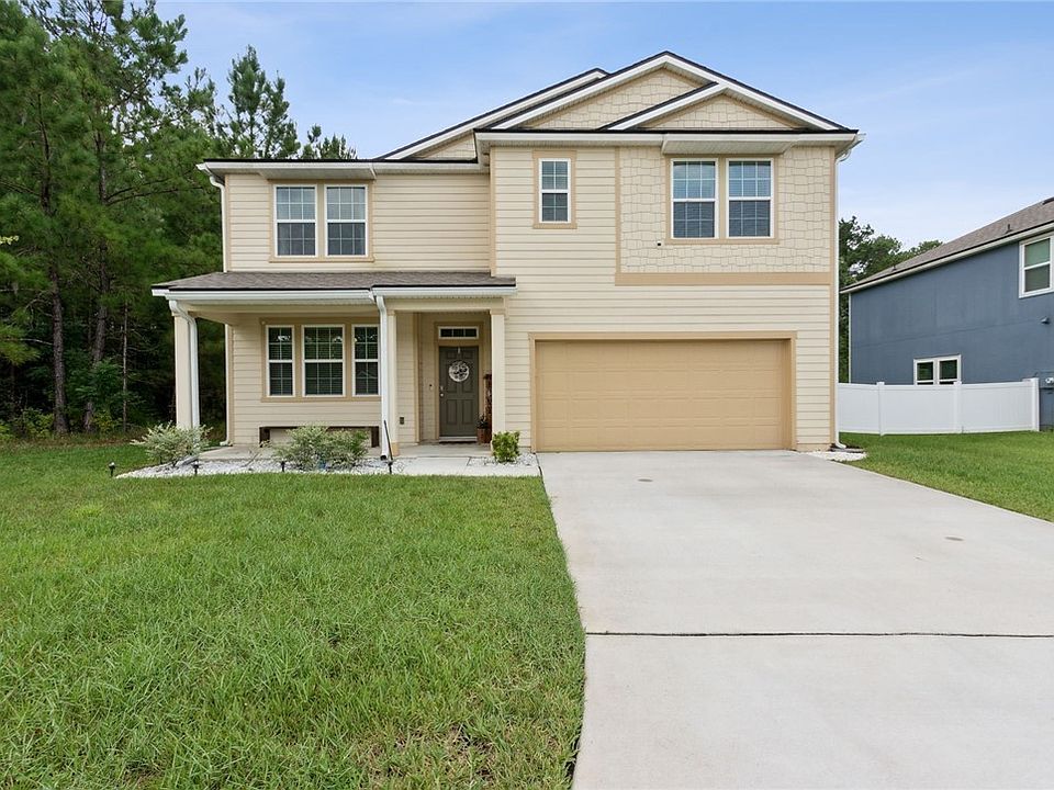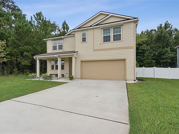 Seller is offering a 1 year 2-10 Home Warranty! Welcome to Waters Edge, Kingsland. Step into this 2021, 5/3, 2616 sqft home with 2 flex spaces! As you enter you will be greeted by an open floor plan with the kitchen and bathrooms protected by vinyl flooring and cozy carpet in the living space and bedrooms. The kitchen is adorned with stainless steel appliances, a breakfast area and an island with ample countertop space. This home offers a flex space, plus a bedroom and full bath on the main level, as well as, 4 bedrooms, 2 full baths and another flex space on the second level. The laundry room is conveniently located on the second level with the bedrooms. The primary bedroom is adorned with an en suite with dual vanity and a walk-in closet. This home also provides a 2-car garage with auto door opener. Just as an added plus, if yard work isn't your thing, the front yard is maintained by the community association.