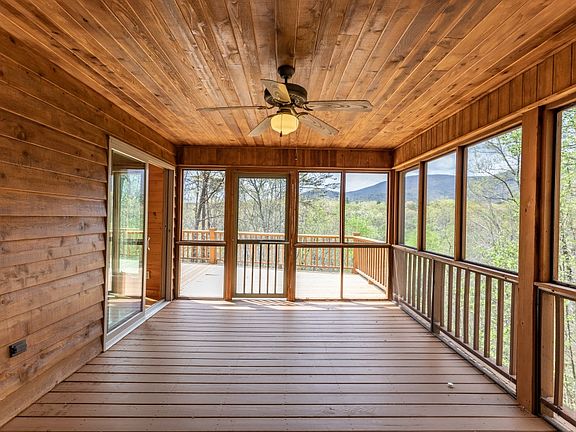 Here, it's all about the views & this hillside home doesn't disappoint! The breathtaking drive leads to a private setting surrounded by trees on 3 sides. From the wraparound deck & screened porch to the spacious patio on the ground level, there's plenty of options for entertaining. The main floor boasts a LR w/ cathedral ceiling, a 2-story wall of windows, stacked stone FP (wood), & access to the deck & screened porch; spacious kitchen w/ granite c-tops, loads of cabs, & S/S apps; 2-vanity hall BA w/ step-in shower; & 2 BRs; T&G walls/ceiling & HW floors (tile in BA). Upstairs loft area, primary BR w/ private balcony, & full BA w/ step-in shower; T&G walls/ceiling & HW floors (tile in BA). Terrace level offers 2-vanity hall BA w/ step-in shower, 2 BRs w/ patio access, spacious laundry room w/ sink & extra storage; T&G walls/ceiling & tile floors. Plenty of parking. MUST SEE!