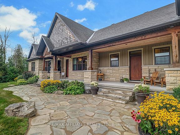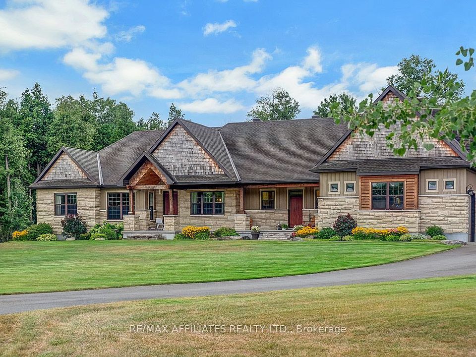 Rarely available, an executive 3 bed & 3 bath bungalow in Stittsville's most unique enclave - Jordan Estates. Renowned for its large estate lots, natural gas & proximity to Main St, it is a stunning neighbourhood of custom-built homes. Situated on a gorgeous tree lined 1.974 acres, this property was custom built and maintained with attention to every detail, it provides a modern split bedroom design, while offering one level living with 3100sq ft+. The well-appointed mains rooms, and open plan Foyer, Dng & Lvg rooms are anchored by the gorgeous floor to ceiling stone gas fireplace. The Lvg room is filled with natural light, from floor to 16+ ft vaulted ceilings. Formal Dng room with accent wall. Convenient Office with privacy French doors and northerly views. The heart of the home, the Kitchen, was designed for large gatherings and is sure to please any chef/baker. Commercial grade side by side s/s Fridge/Freezer, 4 burner gas stove, massive centre island with sink, and cocktail side bar with wine fridge, makes feeding a crowd a delight. The seamless indoor to outdoor transition/flow, with expansive windows & doors, creates an extension of the Kitchen & Eating area into the 3-season screened in porch with private sunset views. Primary suite with calming neutral colours and decor, o/s windows, walk-in closet and a luxurious 5-piece ensuite w/ water closet. Located at the opposite end of the home are 2 additional generous sized bedrms, each with their own W/I closet and 3-piece ensuite. Heated 3 car/truck garage, with separate direct access to mud room and lower level, all set for tools & toys. Additional o/s parking for RV/Boat/Trailers in the private rear lane. Warm maple hardwood floors throughout the main rms, travertine tiles, deep baseboards, wide trim work, granite counters throughout, shiplap, accent walls, neutral paint colours & o/s windows everywhere, are just a few of the details that give this property the aura of subtle sophistication it deserves.