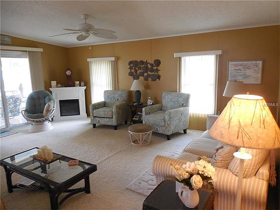 Very attractive, well kept home with nice landscaping. The living room and master bedroom are very large. The kitchen is equipped with a bottom drawer refrigerator, a smooth top stove, dishwasher, built-in microwave oven over the stove and a disposal. There are a lot of ceiling fans. Smoke alarms are provided for your safety. Newer entry door and railing are also in place. There is a nice laundry room with a stacked washer and dryer. The outside of the home has gutters and downspouts and window awnings along with shutters. The shed is on the carport with a golf cart garage door and a separate entry door. There is a 12'' X 12'' screen room located at the front of the house. A new air conditioner was added in 2012.